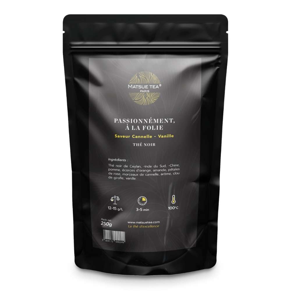 El té negro natural APASIONADAMENTE, LOCO POR TI de calidad PREMIUM de MATSUE TEA es una verdadera invitación a un viaje sensorial. Las notas afrutadas de la manzana y la naranja se combinan perfectamente con los sabores especiados de la canela y la vainilla, mientras que los pétalos de rosa añaden un toque floral delicado.