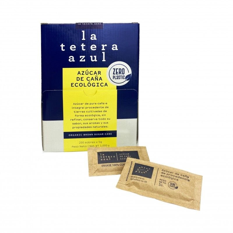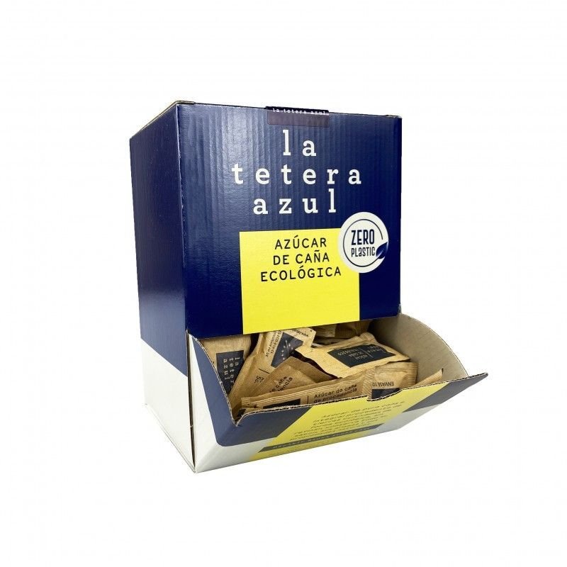 Caja de 200 bolsitas de 5 gramos de azúcar de caña ecológica.