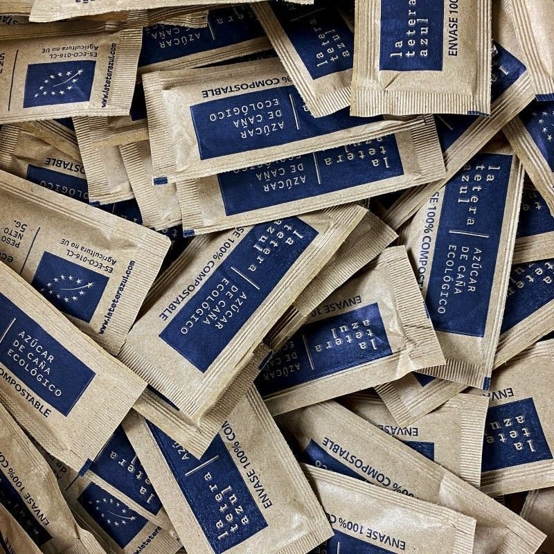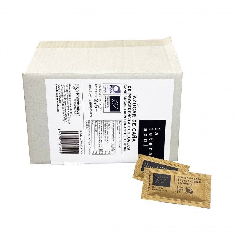 Caja de 500 bolsitas de 5 gramos de azúcar de caña ecológica.