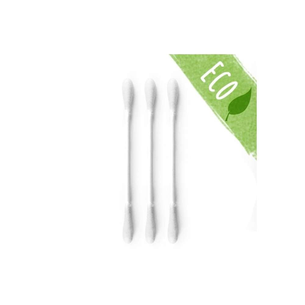 Caja de 500 set de 3 bastoncillos de algodón natural orgánico envueltos individualmente en bolsa biodegradable para oídos o manicura. Complemento ideal para amenities de hoteles y apartamentos.