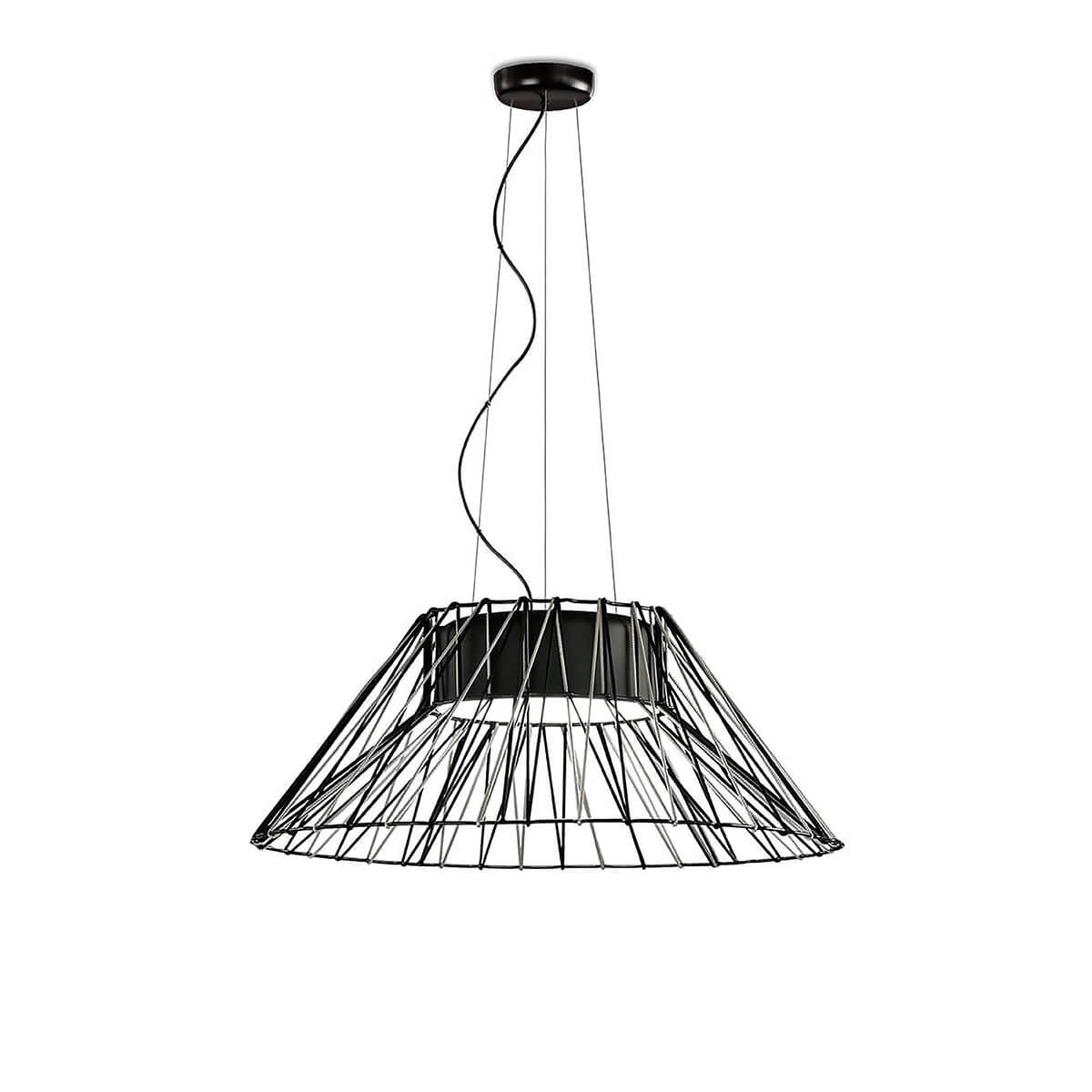 Lámpara colgante sostenible de Ø80 cm hecha de cuerda fabricada con botellas de plástico recicladas, trenzada artesanalmente sobre una estructura metálica negra y una pantalla metálica negra en su interior. Escoge un solo color o combina dos.