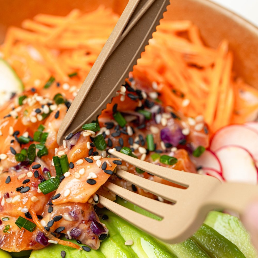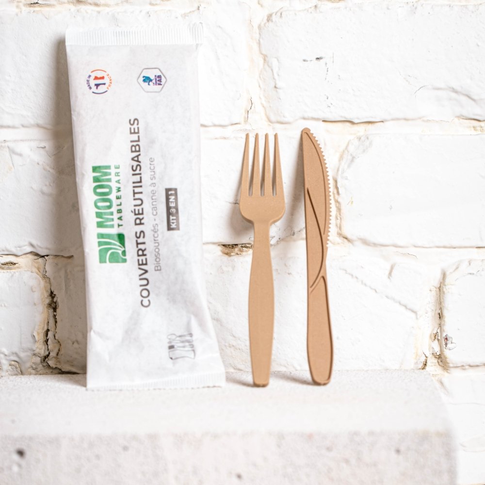 Un tenedor y un cuchillo de 16 cm – Fabricados en bagazo biosostenible, garantizan un agarre cómodo y una sensación agradable en boca.