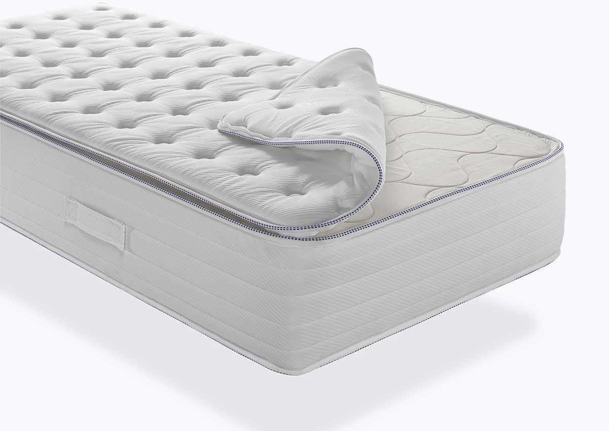 Colchón de muelle ensacado en altura 3o cm. Todo el confort a una cara y rotación de cabeza a pies. Cremallera perimetral para poder cambiar el acolchado y alargar la vida del producto. Siempre como nuevo. ¿Tu cliente acaba de derramar una copa de vino y ha traspasado las sábanas manchando el colchón?. No hay problema, en 48 horas puedes recibir tu capa de acolchado nueva sin necesidad de tirar el colchón y bloquear la habitación. Mientras recibes la nueva capa de acolchado, el producto puede seguir en uso.