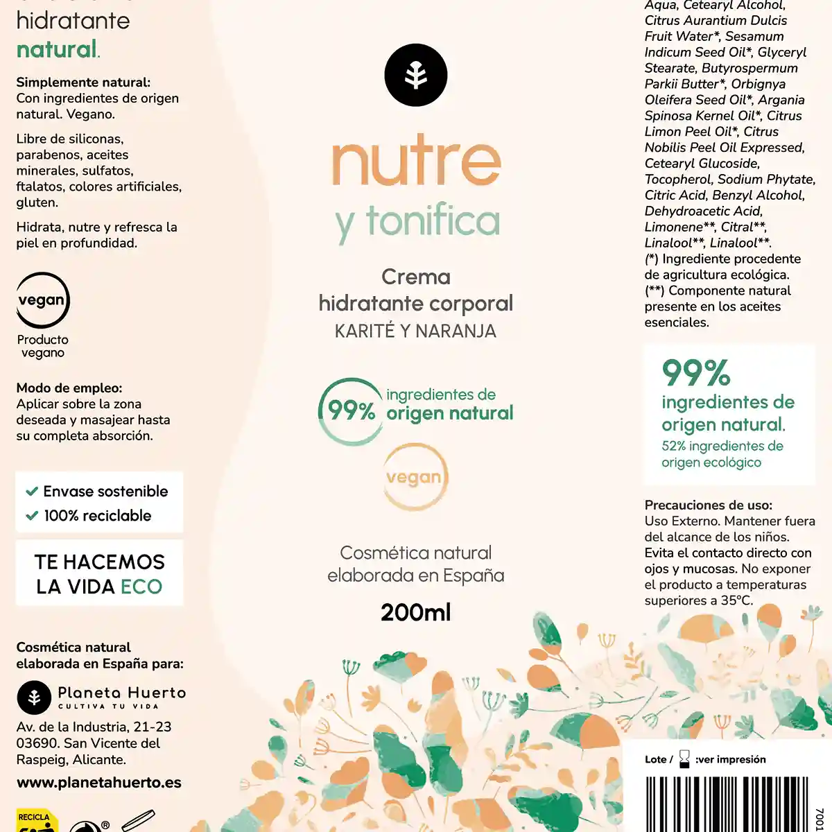 Aqua, Citrus Aurantium Dulcis Fruit Water*, Sesamum Indicum Seed Oil*, Glyceryl Stearate, Cetearyl Alcohol, Cetearyl Glucoside, Butyrospermum Parkii Butter*, Orbignya Oleifera Seed Oil*, Argania Spinosa Kernel Oil*, Citrus Limon Peel Oil*, Citrus Nobilis Peel Oil Expressed, Tocopherol, Sodium Phytate, Benzyl Alcohol, Dehydroacetic Acid, Limonene**, Citral**, Linalool** (*) Ingrediente procedente de agricultura ecológica (**) Componente natural presente en los aceites esenciales Producto natural con un 54% de ingredientes ecológicos.