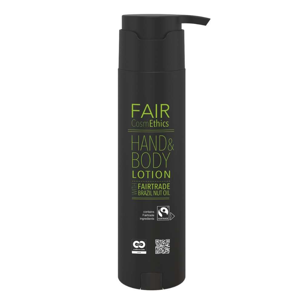 Fair CosmEthics emerge como una destacada colección de amenities, fusionando calidad, sostenibilidad y responsabilidad social. Con una formulación a base de plantas, la locíon para manos y cuerpo 300ml para hoteles desprende un cautivador aroma afrutado y fresco, teñido de notas florales y alegres, equilibradas con toques cálidos y amaderados que confieren una singular expresividad sensorial.