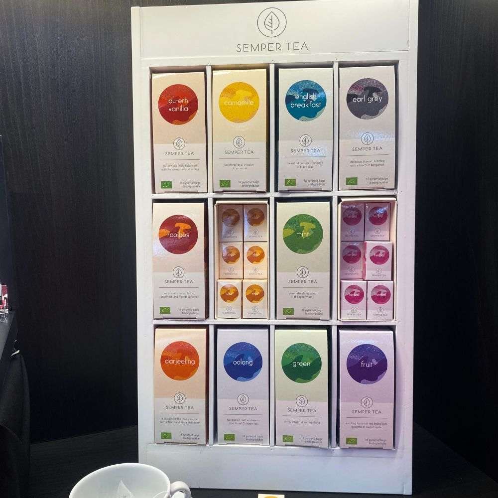 Diseñado para mejorar la experiencia de tus clientes de manera eficiente y sofisticada. Con separadores individuales, garantiza una presentación impecable y organizada de las variedades de té Coral, un té ecológico y en pirámides biodegradables.