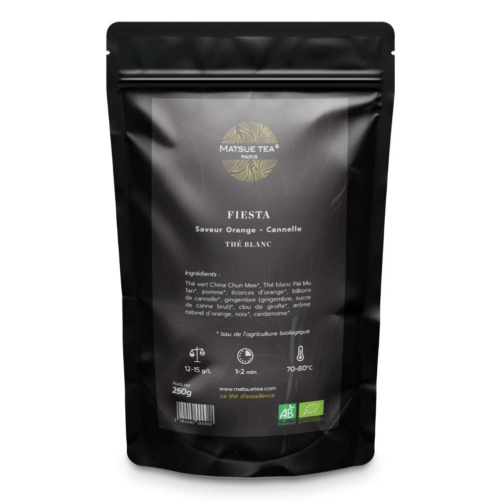 El té verde y blanco orgánico FIESTA de calidad PREMIUM de MATSUE TEA es una mezcla de té verde Chun Mee orgánico y té blanco Pai Mu Tan orgánico. Su combinación ofrece un sabor sutil y ligero, y la adición de canela y naranja refuerza su gusto. Además, se han añadido trozos de cáscara de naranja y jengibre para completar esta maravillosa composición frutal.