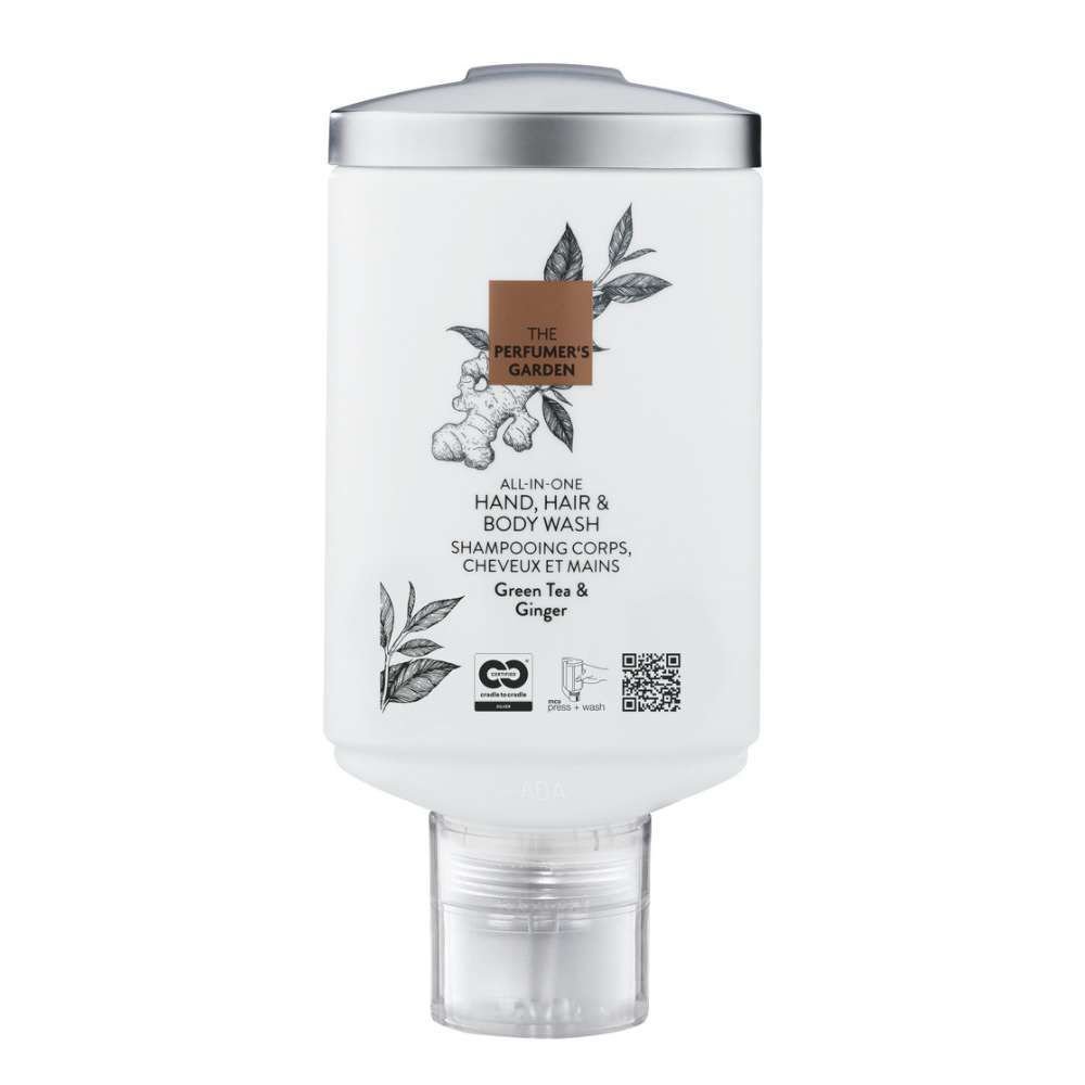 El diseño moderno y elegante de la gama se adapta perfectamente a cualquier baño, mientras que el Gel corporal y capilar suave y revitalizante, basado en una fórmula probada en el tiempo y contenido en un embalaje mono-material reciclable, garantiza una experiencia de cuidado personal que conjuga lujo y responsabilidad. Con The Perfumer’s Garden, la belleza y la sostenibilidad convergen, ofreciendo una experiencia que cautiva los sentidos y respeta el planeta.Gel mixto de manos, cabello y cuerpo 330ml para hoteles