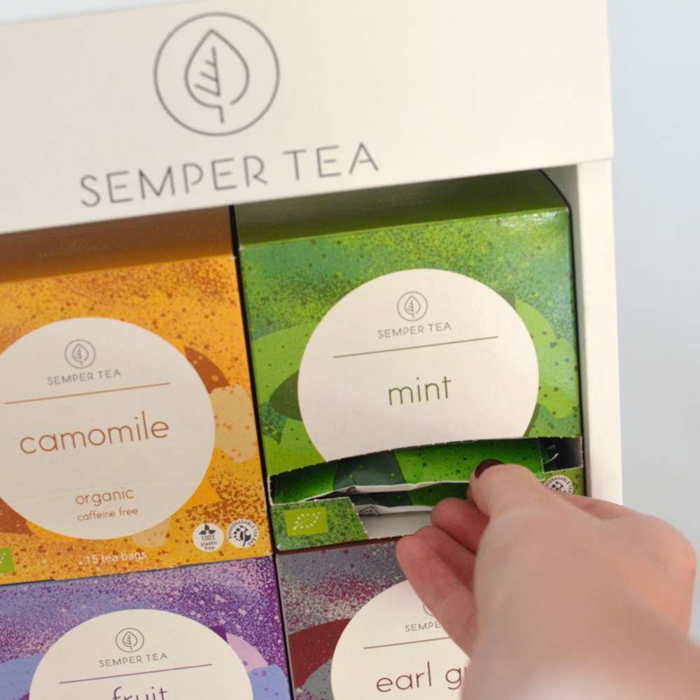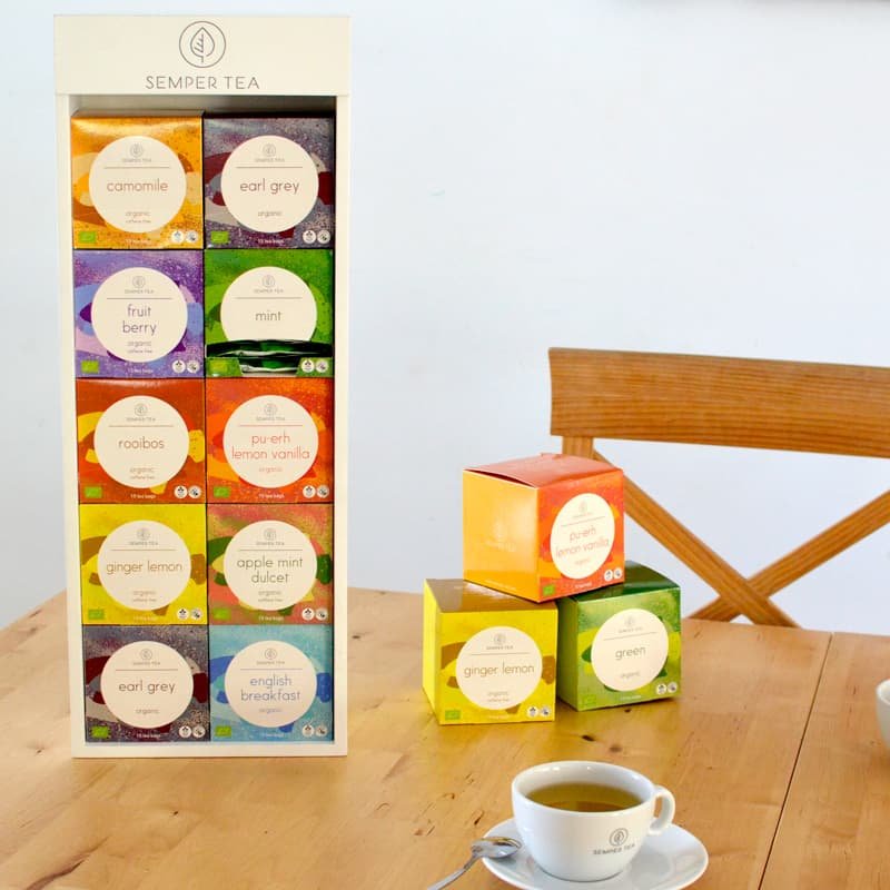 Presentado en un expositor de té de madera lacado en blanco con separadores individuales.