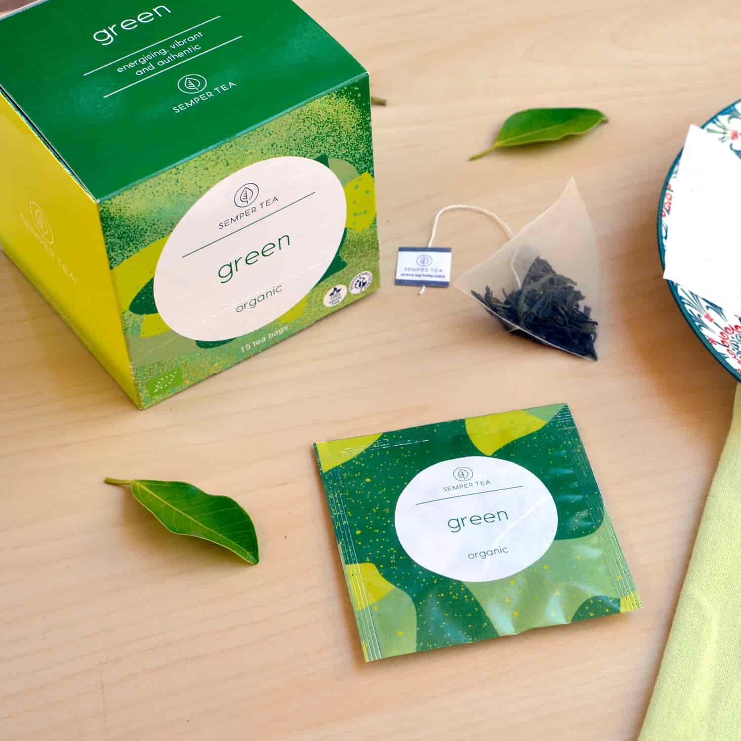 Selección de té ecológico en pirámides biodegradables, envasadas individualmente.