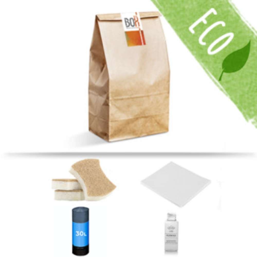 El kit de limpieza Terral ecológico està presentado en bolsa de papel kraft y consta de los elementos básicos para la limpieza de la cocina y la vajilla.