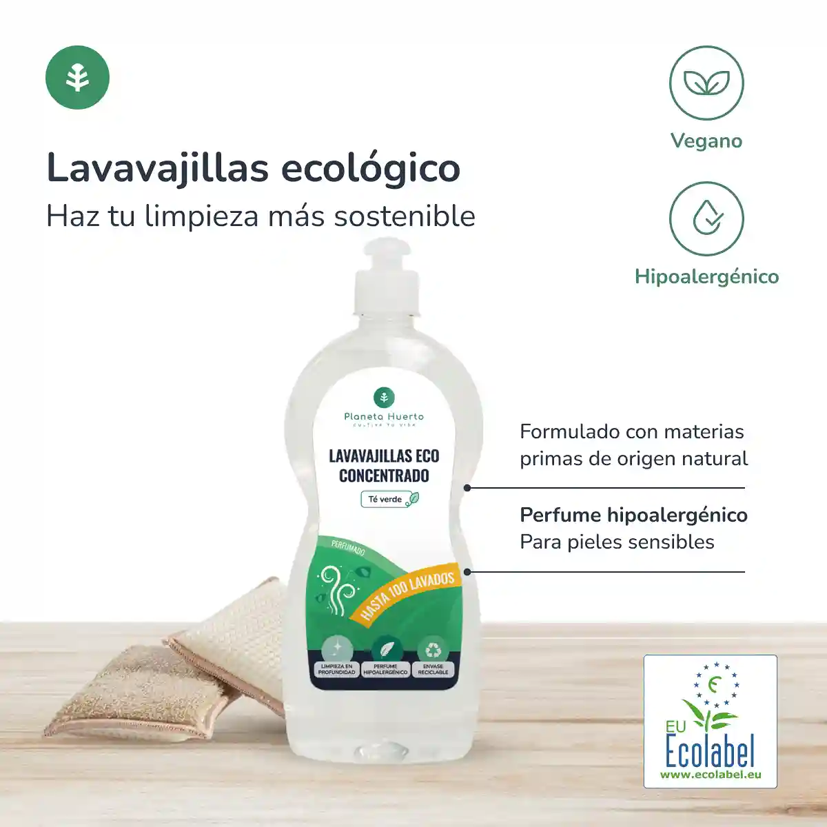 Lavavajillas manual concentrado ecológico de pH neutro formulado con materias primas de origen natural y elevado nivel de biodegradabilidad que limpia y desengrasa todo tipo de utensilios de cocina a la vez que respeta la piel.
