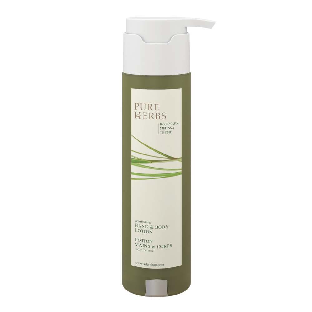 Loción manos y cuerpo 300ml para hoteles Pure Herbs, sostenible y calmante, con ingredientes naturales y un aroma revitalizante de romero, melisa y tomillo para una experiencia de bienestar única. Presentado en un envase de 300 ml con el innovador sistema Shape, es la opción sostenible para tu rutina diaria.