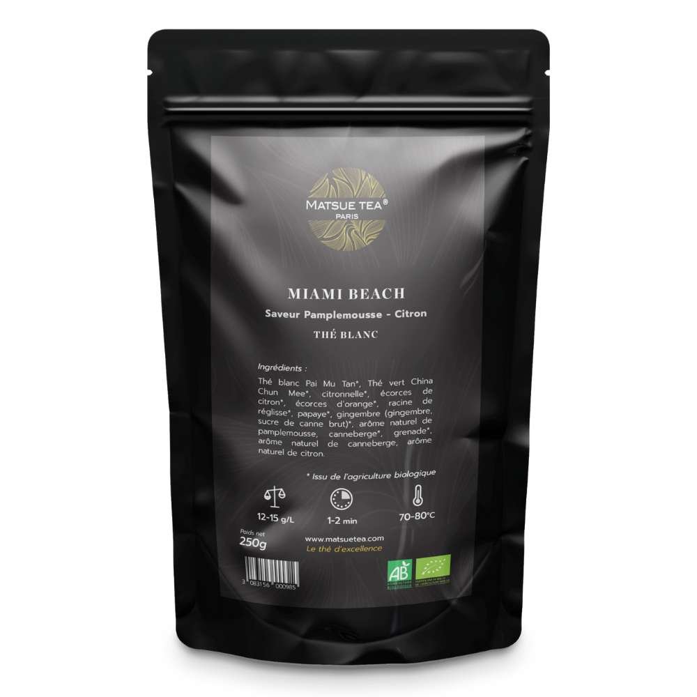 El té blanco orgánico MIAMI BEACH de calidad PREMIUM de MATSUE TEA es una mezcla de té blanco Pau Mu Tan y té verde China Chun Mee acompañado de cítricos y frutos rojos. También apreciarás los trozos de papaya, arándano y granada que aportan a este té un sabor majestuoso. Y la mezcla cítrica, fresca y frutal es perfecta para refrescarse en los días calurosos de verano y para añadir un toque de sol en invierno.