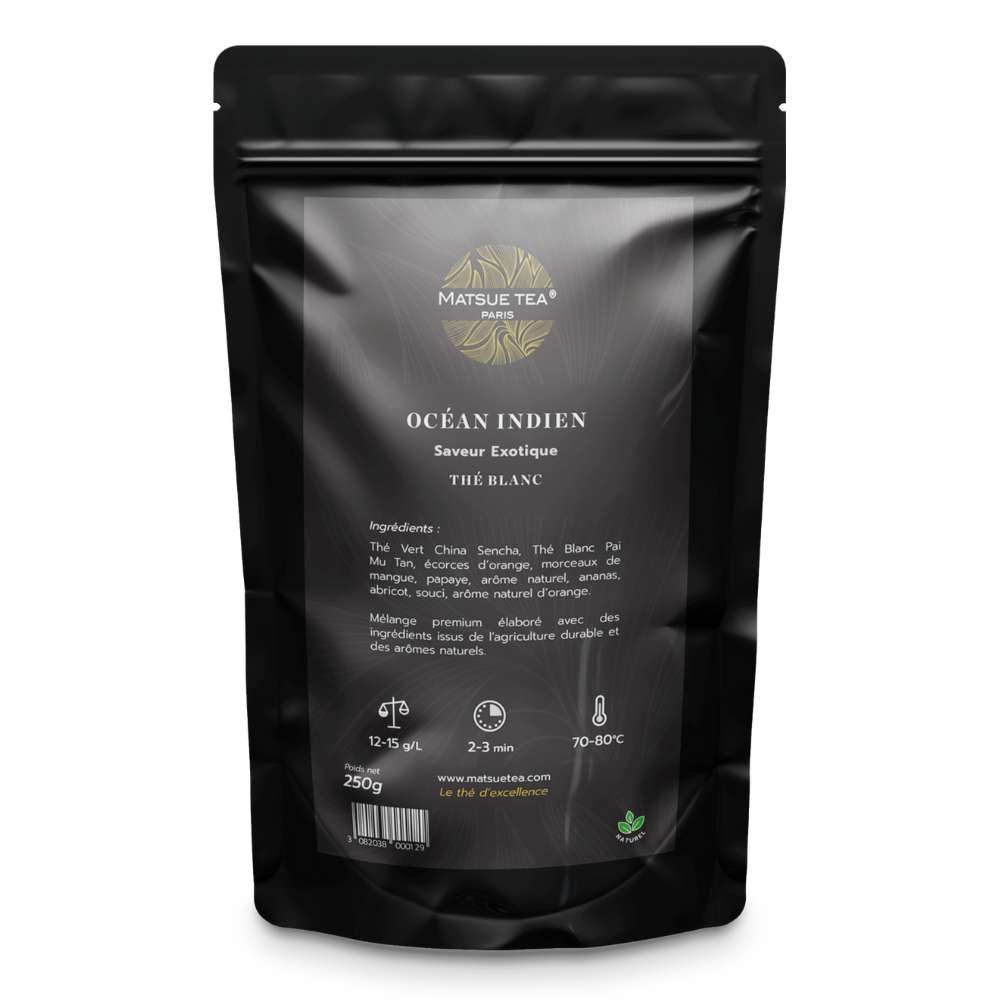 La mezcla de té verde y té blanco natural OCÉANO ÍNDICO de calidad PREMIUM de MATSUE TEA es una verdadera invitación a viajar. Sus notas de piña y albaricoque evocan los sabores tropicales del océano Índico. La combinación con el té blanco Pai Mu Tan, conocido por su suavidad y delicado aroma floral, así como el té verde Sencha, aporta una sutil complejidad al conjunto. Las cáscaras de naranja añaden un toque cítrico que se fusiona perfectamente con las frutas exóticas para un té refrescante y delicioso.