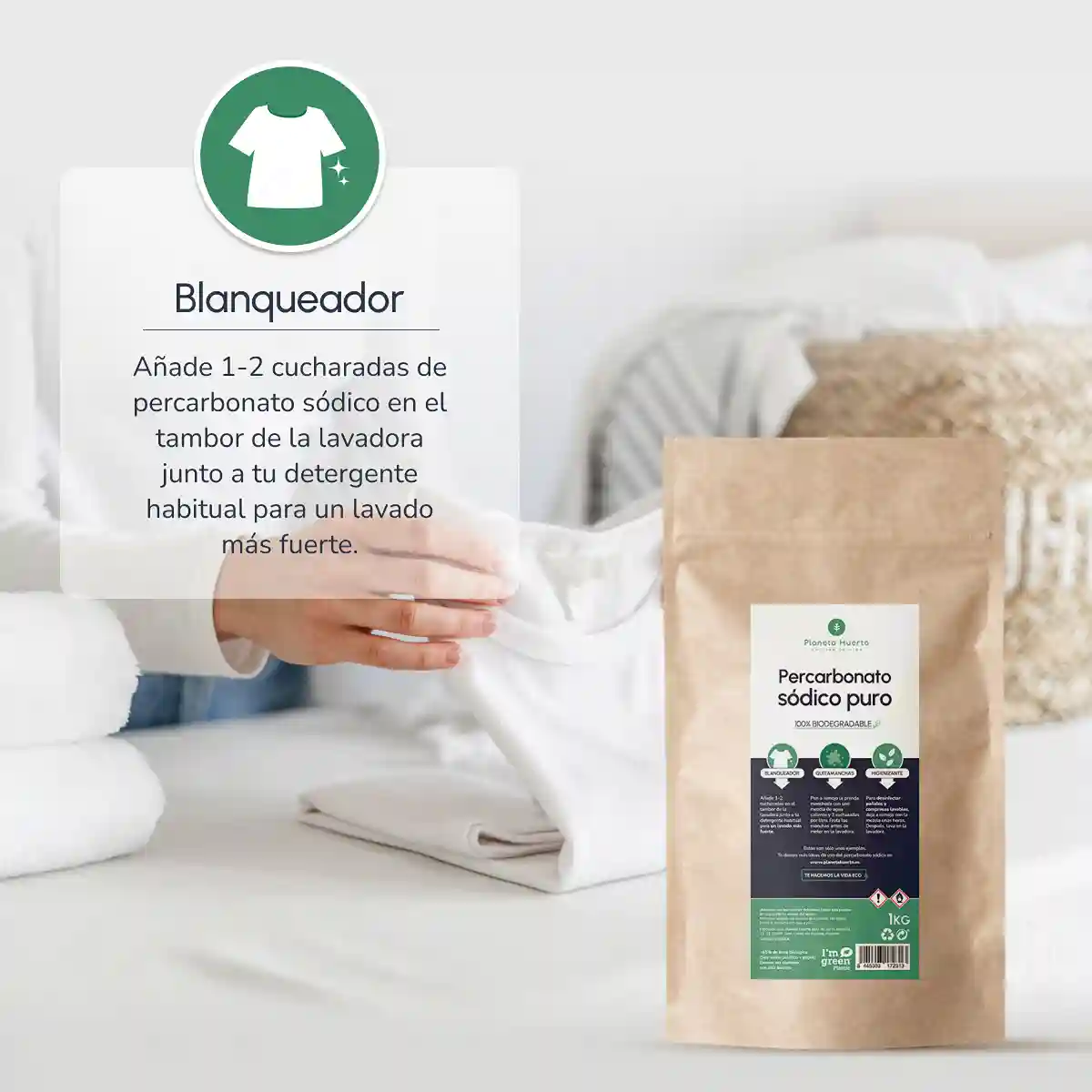 • Seguro para el medio ambiente: A diferencia de la lejía a base de cloro, el percarbonato sódico se descompone en agua, oxígeno y carbonato de sodio, por lo que es completamente biodegradable y no contamina el agua ni el suelo.