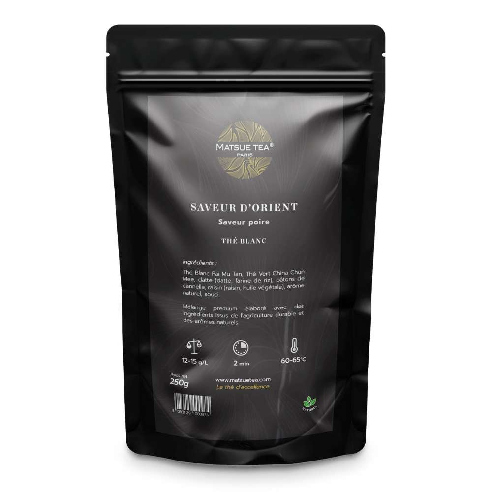 El té blanco natural SABOR DE ORIENTE de calidad PREMIUM de MATSUE TEA es una mezcla sutil de té blanco y té verde Chun Mee, realzada con especias orientales como canela en rama, uva pasa y trozos de dátiles para un toque dulce y delicioso. Una taza del té blanco natural SABOR DE ORIENTE de calidad PREMIUM de MATSUE TEA te transportará al Oriente y te hará descubrir nuevos y exquisitos sabores.