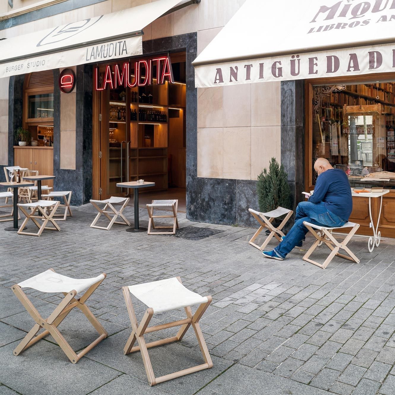 Se inspira en los tradicionales taburetes de tijera. La suavidad de las líneas en su diseño se traslada al mismo tiempo a la forma de plegado.