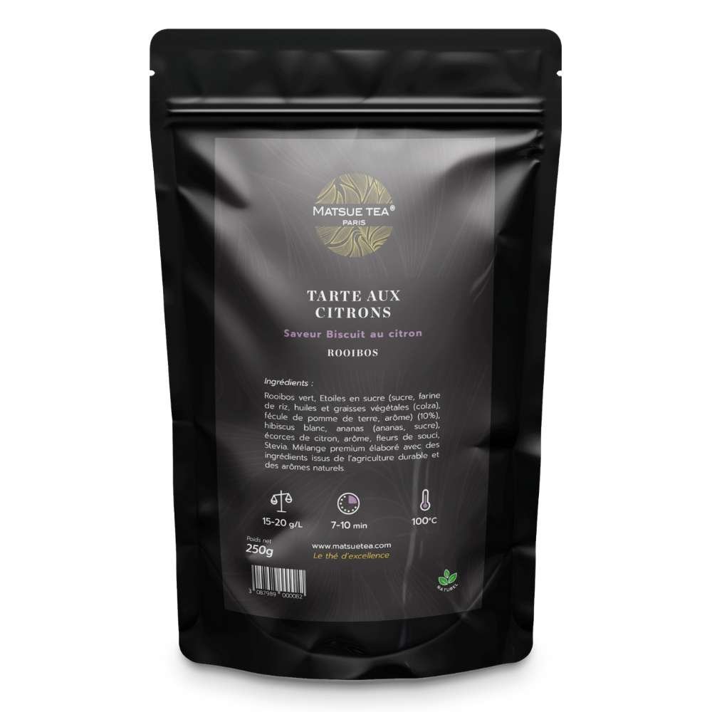 La infusión de rooibos natural TARTE AUX CITRON de calidad PREMIUM de MATSUE TEA deleitará a los amantes con su mezcla de Estrella dulce, hibisco blanco, piña, cáscara de limón y flores de caléndula. Esta mezcla ofrece un sabor afrutado y ácido, perfecto para una infusión refrescante. Además de ser deliciosa, la infusión de rooibos natural TARTE AUX CITRON de calidad PREMIUM de MATSUE TEA ofrece beneficios para la salud gracias a los antioxidantes naturalmente presentes en el rooibos verde.